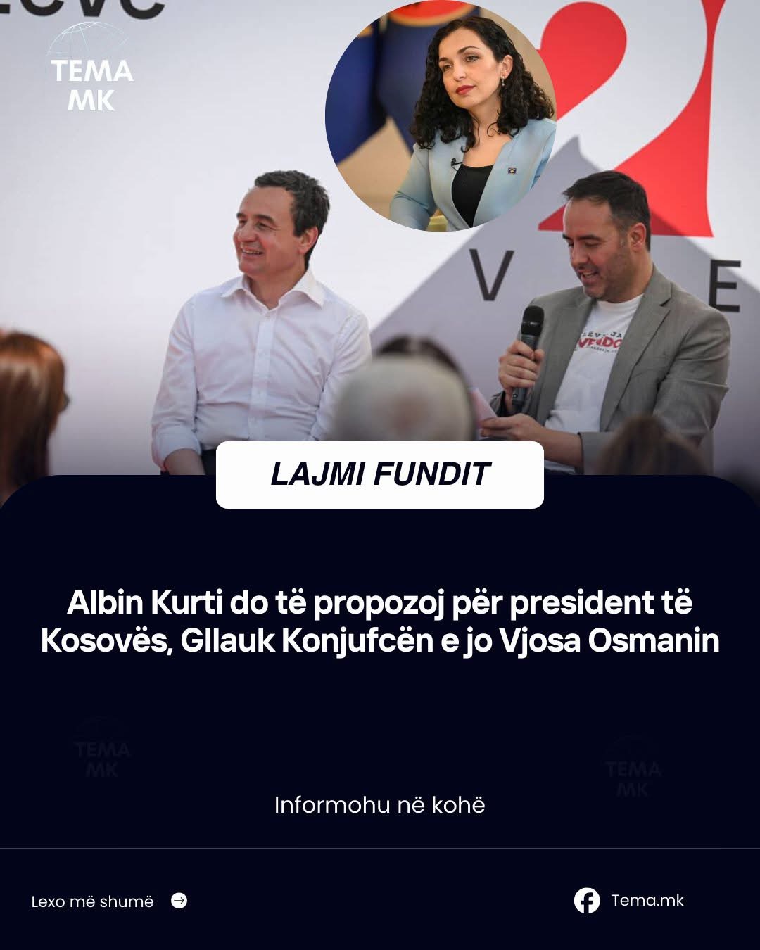 👤Lideri i VV-së, Albin Kurti, nuk e do më Vjosa Osmanin për presidente. Gazeta Nacionale ka mësuar se kryeministri Kurti ka vendosur që ta propozojë Glauk Konjufcën si kandidat për president të Republikës së Kosovës.